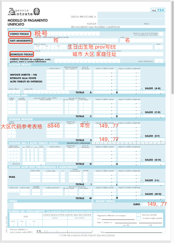 F24表格下载打印地址:https://www.agenziaentrate.gov.it/portale/documents/20143/250689/Modello+di+versamento+unificato+-+F24+Ordinario_i+Modello+F24+%282%29.pdf/b773b043-a490-82de-550a-eda75246efa0